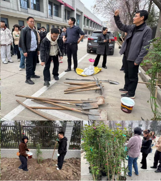 春风送暖,万物勃发。为帮助学生践行绿色环保理念,深化生态文明教育,增强师生凝聚力与集体荣誉感,3月12日下午,音乐系在系楼东侧“一米田园”种植区精心开展以“绿意盎然 艺心同行”为主题的植树节劳动教育活动。全系教职工与各年级学生代表以劳动赴春约,开展了一堂深刻的成长育人课程。学生工作部(就业创业指导中心)副主任杨生强、音乐系党总支书记宋振涛、副主任张帆、副书记孙琳出席本次活动,全体教师与学生代表100余人参加本次活动。
