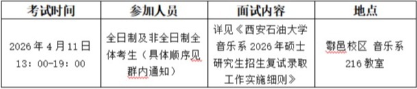 根据《西安石油大学音乐系2026年硕士研究生招生调剂工作实施细则》要求,现将音乐系2026年硕士研究生调剂复试工作安排予以公布。